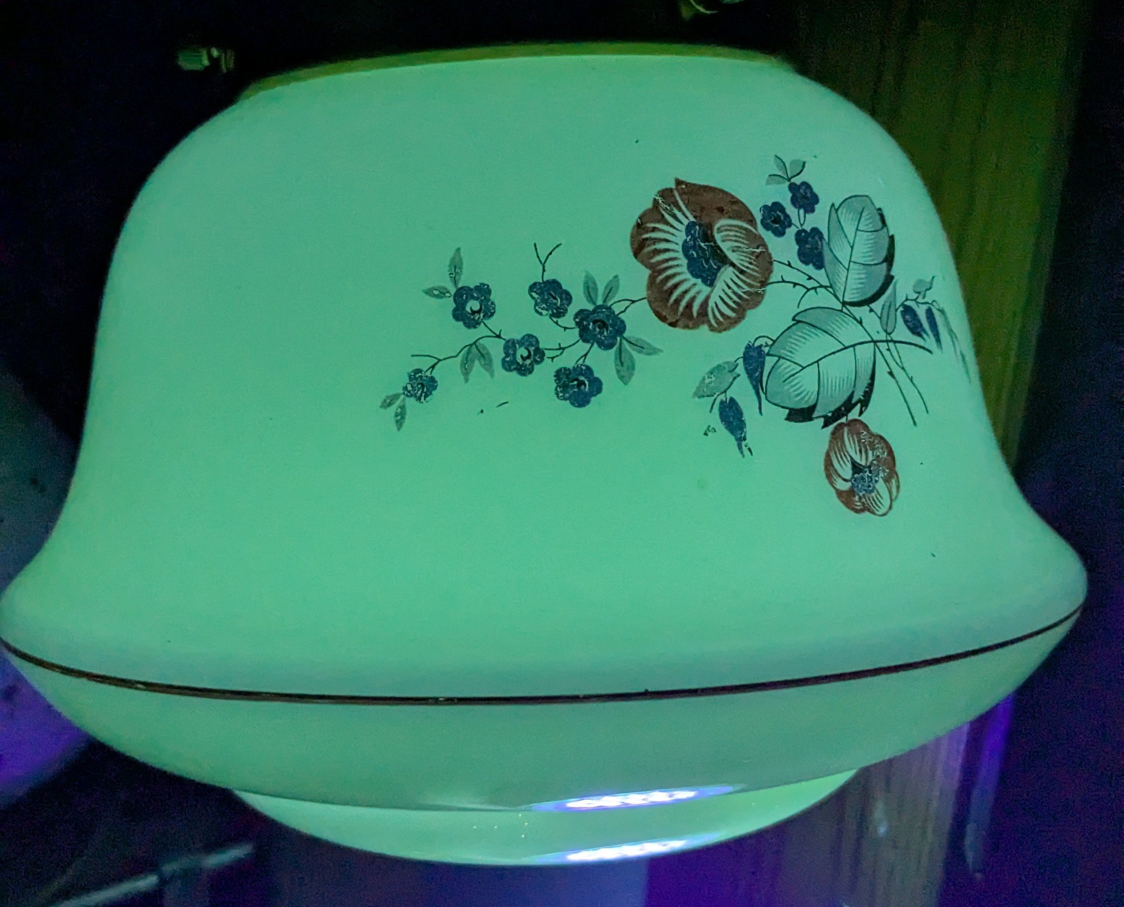 Antik kuglependel. 1940. Fuld restaureret. Ø18. Nyt el og ophæng.. Sjældent Uranium oxid glas