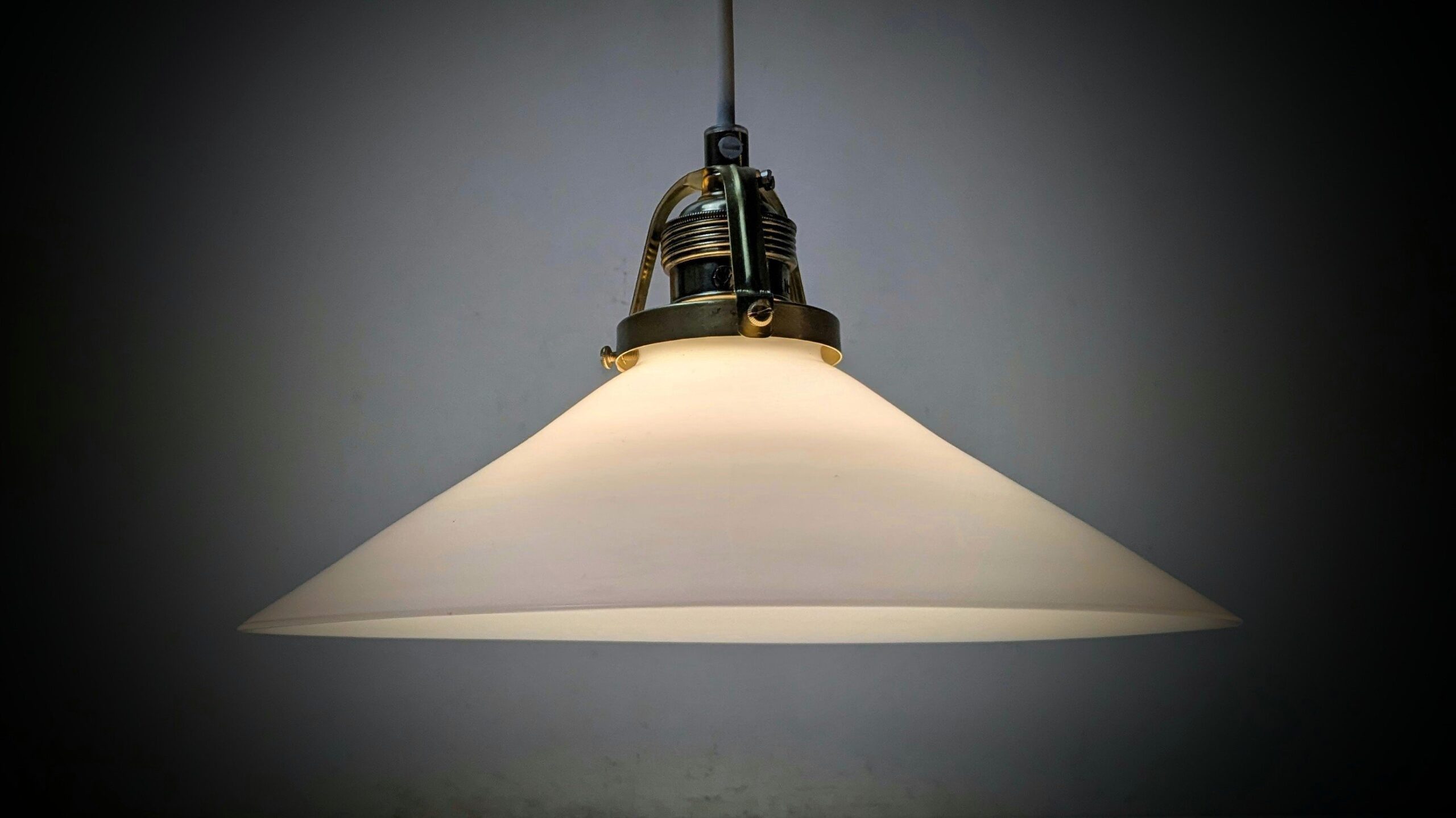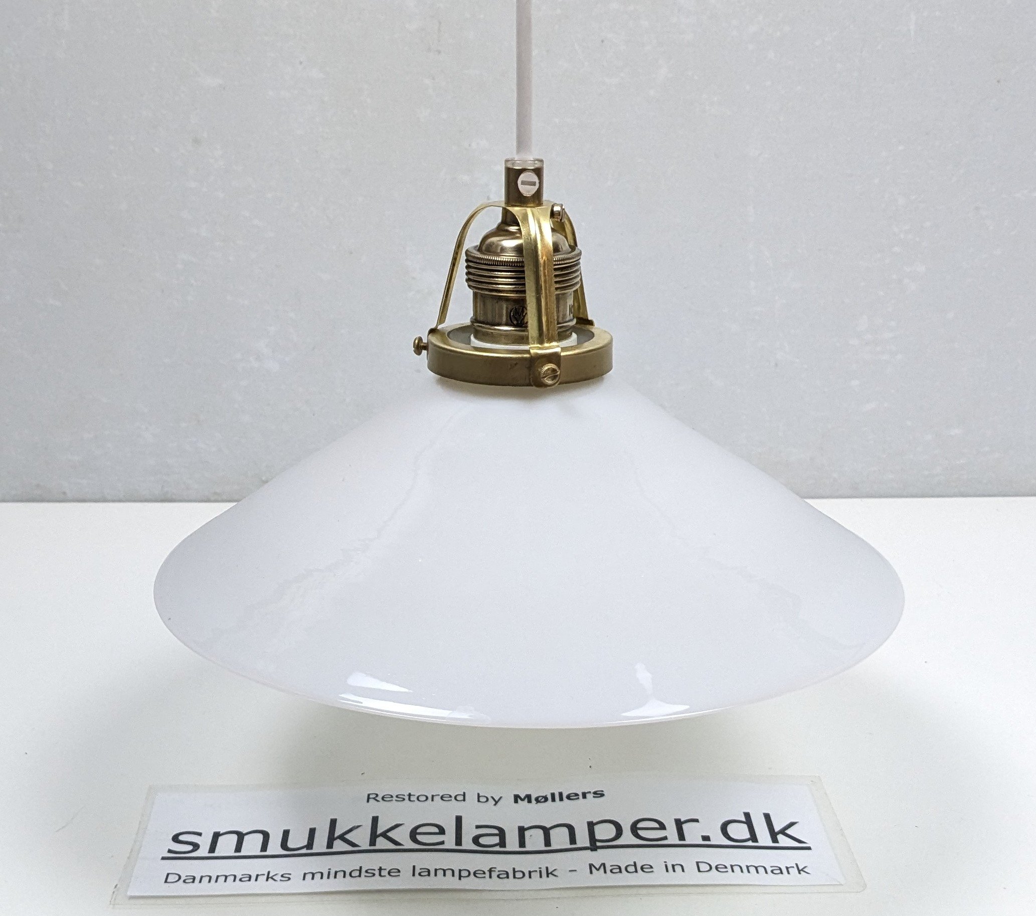 Vores værksted har monteret 2,5 meter ny hvid ledning, nyt rent messing ophæng, samt ny messing aflastning.