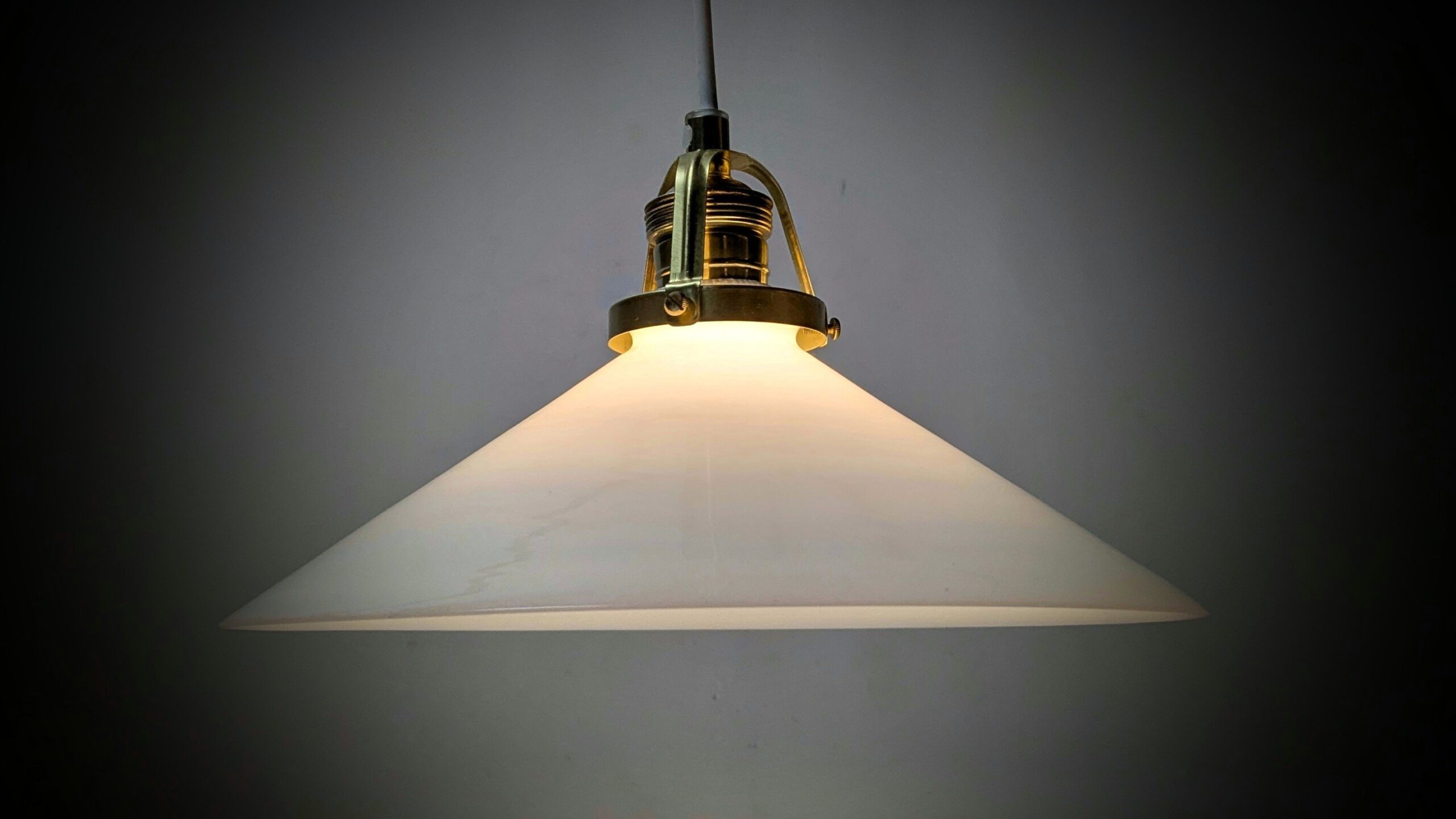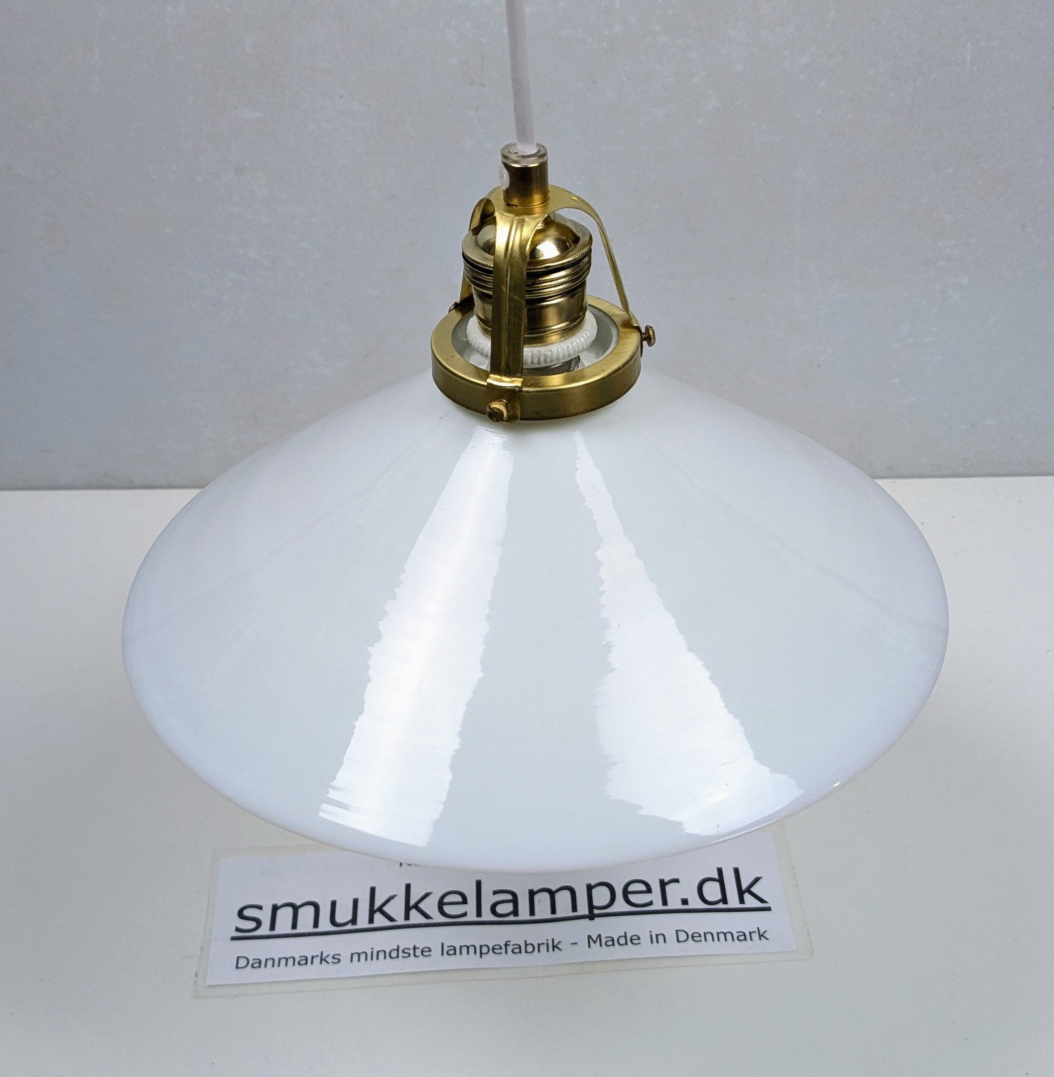 Vores værksted har monteret 2,5 meter ny hvid ledning, nyt rent messing ophæng, samt ny messing aflastning.