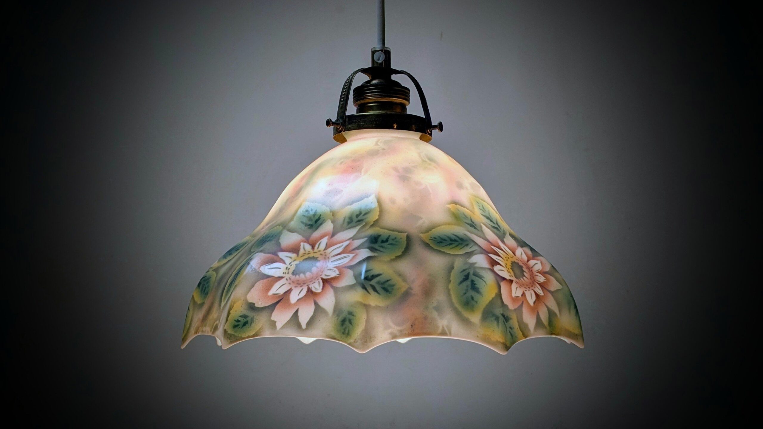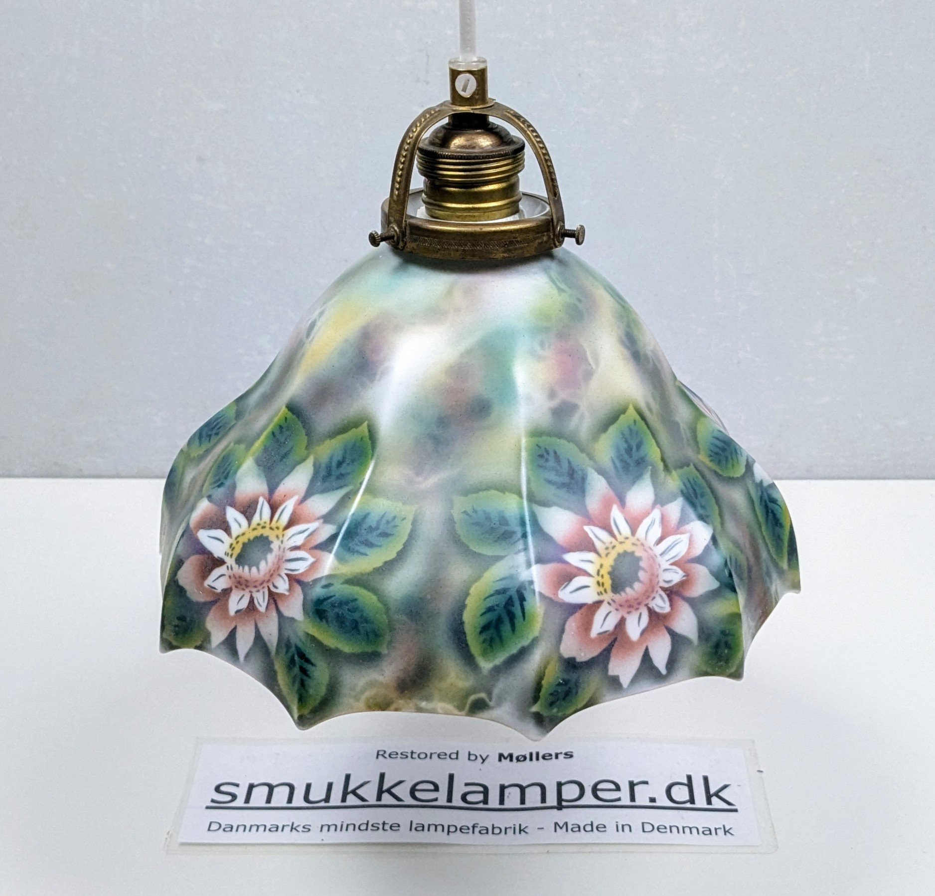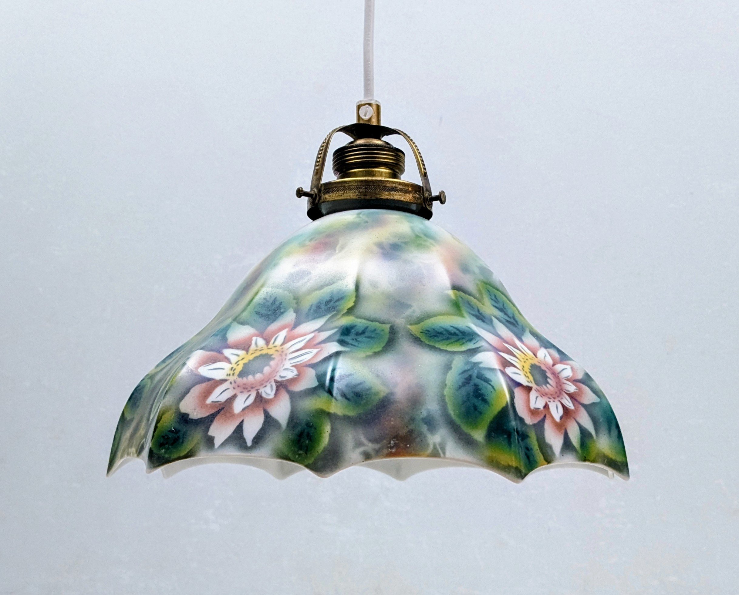 I særdeles usædvanlig flot stand for en paraply pendel som er håndmalet med grønne blade og blomstermotiv.