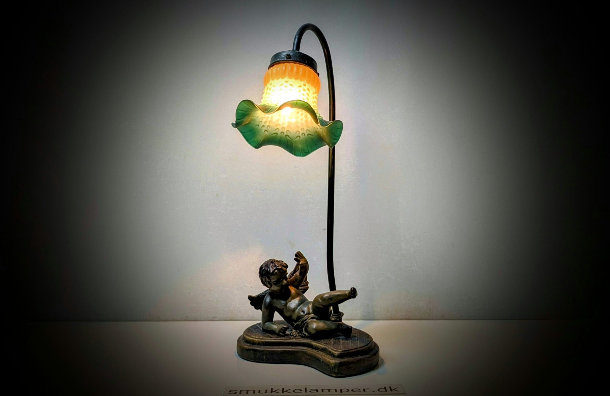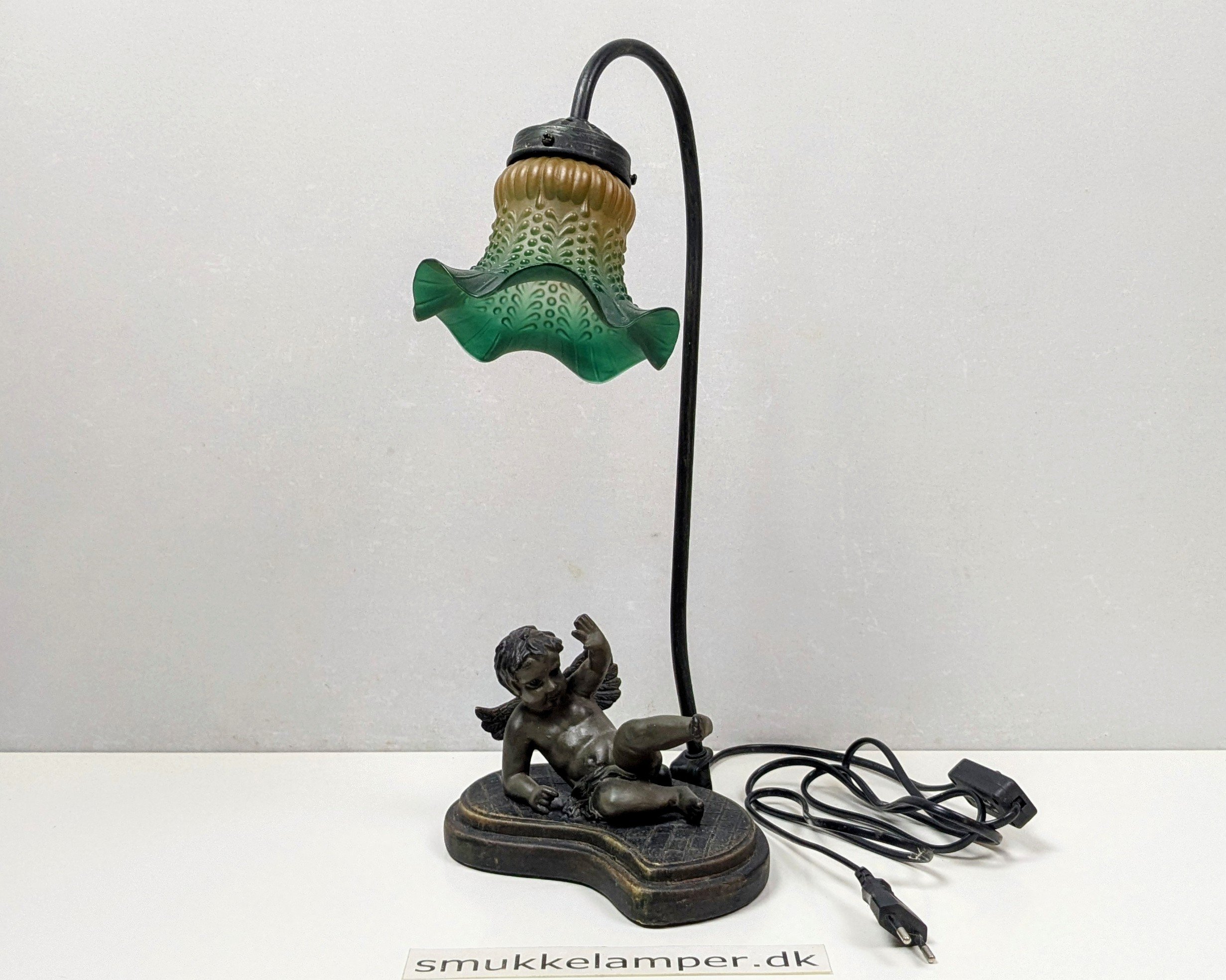 Skøn bordlampe med buttet engel og grøn glas. 1990. 44cmH