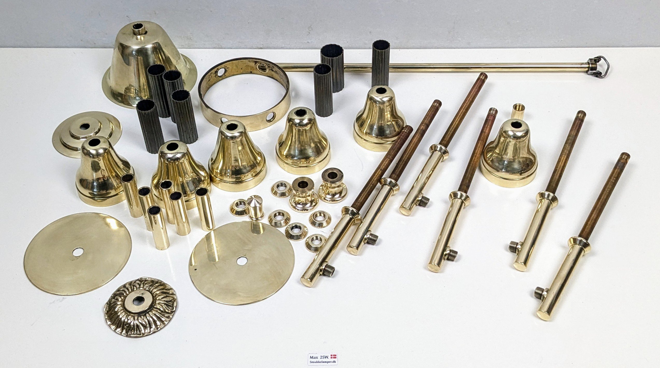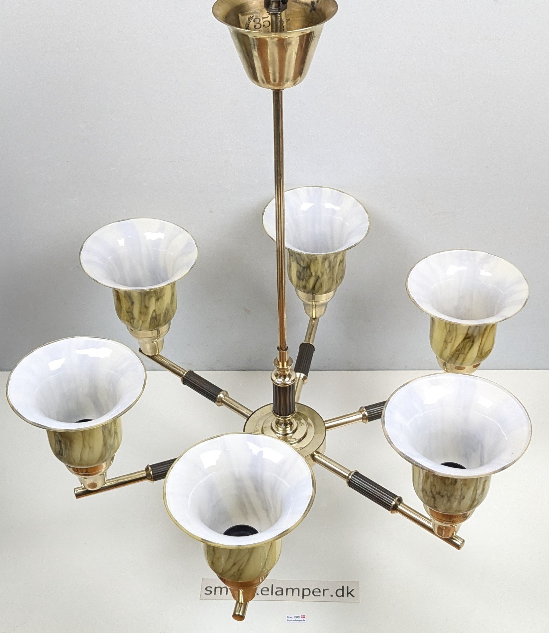 Vores værksted har adskilt denne smukke lysekrone og nypoleret alle dele. Derudover har vi monteret andre glasholdere og nelt nye sjældne marmorerede lampeglas.